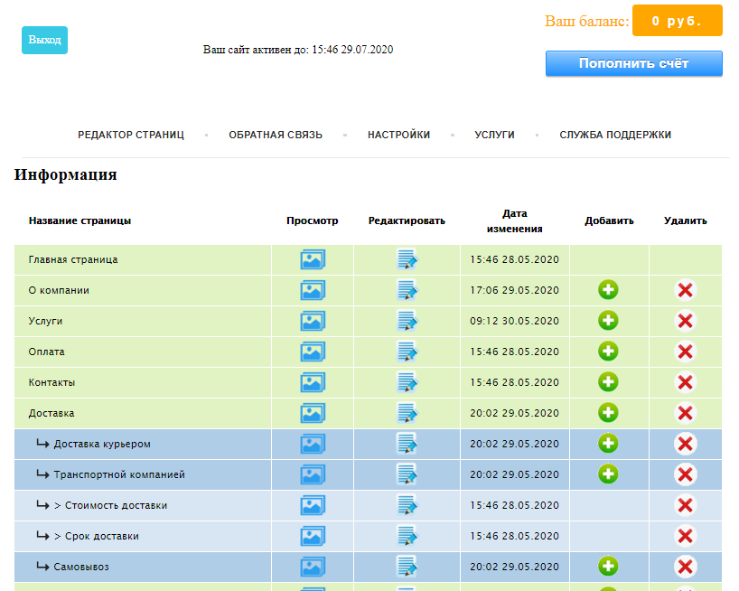 Добавление 5 страниц сайта при создании, далее на платной основе или самостоятельно.
